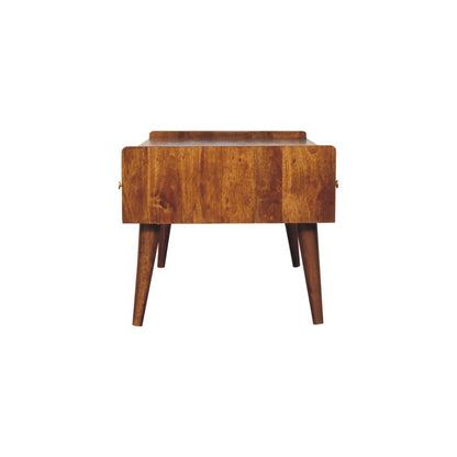 This media unit is beautifully crafted from 100% solid mango wood with a chestnut finish that enhances its natural grain. The design features slightly raised edges, giving it an elevated look that adds a touch of sophistication to any living space as well as standing on 4 nordic style legs. This table not only serves as a central piece for your living area but also blends functionality with style.