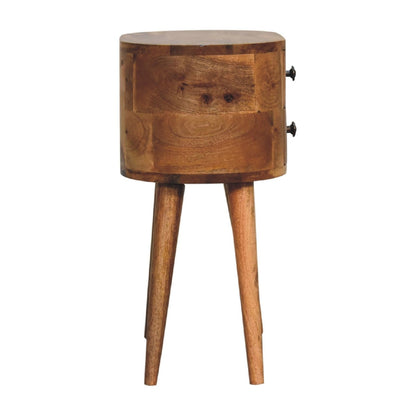 This mini solid wood bedside has been constructed from 100% solid mango wood in a oak-ish finish and offers a uniquely shaped design with rounded edges. It features 2 mini drawers which come with a shiny knob and Nordic-style legs. A great, simple addition to the bedroom.